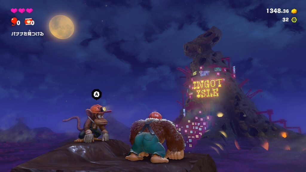 ステージ中には「バナナ」がいたるところに埋まっており、それをアクションを駆使して探索・獲得していくのが主なステージの目的になります。(マリオオデッセイの様な感じです)