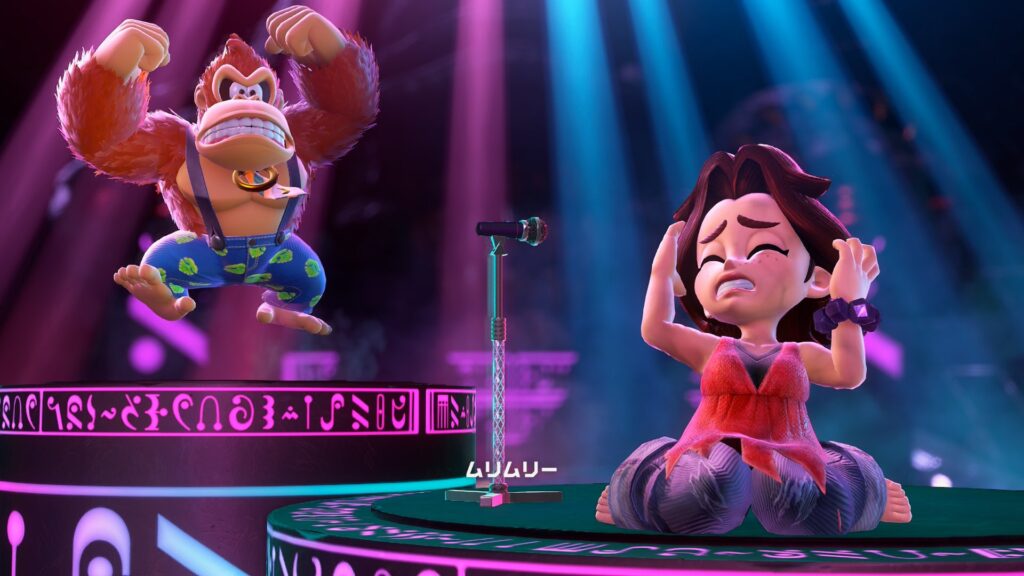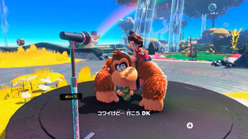ドンキーと一緒にリアクションしたり、ドンキーのアクションに巻き込まれないよう必死に喰らいついていたり、バナンザ変身中は後方でノリノリでアルトネリコ歌っていたりと愛くるしいアクションを繰り広げています。