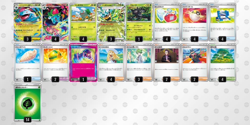 特性「生い茂る」を持った非エクのメガニウムと、スタジアム「活力の森」を組み合わせた草デッキとしてレギュ変更前も一定数活躍していましたが、レギュ変更後に大きく躍動し始めています。