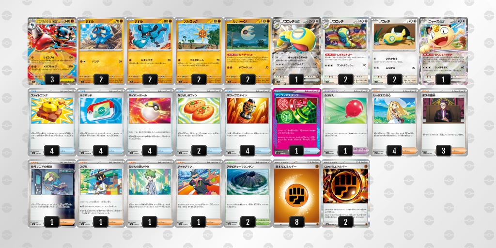 メガルカリオデッキと言えばルナトーンの特性「ルナサイクル」のドローによる抜群の安定感を誇る人気デッキです。